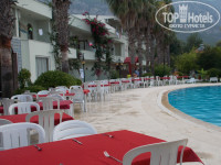 Территория отеля большая, очень зеленая, много фруктовых деревьев ( апельсины, лимоны, груша, инжир, гранат) и различных цветов. Все чисто и ухожено. Бассейн чистый, всегда есть свободные шезлонги, но зонтиков мало.