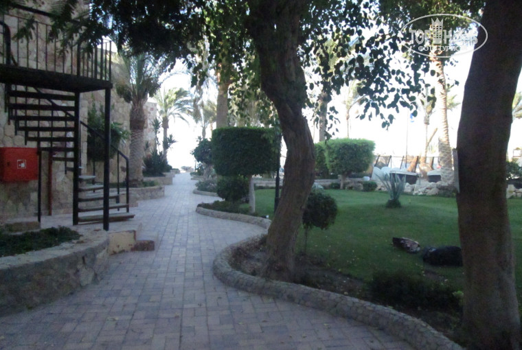 Территория отеля находится на небольшом склоне, имеет прямоугольную форму и начинается вверху на ресепшен, далее имея пологий спуск мимо бассейна к морю.