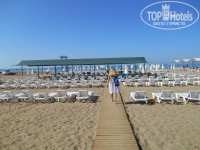 Отдыхала в июле с дочкой (19 лет). В Турции восьмой раз, останавливалась в разных районах, в отелях 4-5 звезд. Этот отель выбрали из-за достаточно низкой стоимости, связанной с недавним открытием, и хорошего моря. Приехали ночью, заселили естественно сразу. Ночной ужин уже прошёл, но с дороги хотелось чего-то горяченького. В номере был чайник и две чашки, но не было ни пакетиков чая-кофе, ни сахара, ни ложечек. Возможно, в будущем они всё это будут пополнять, но пока пришлось ждать завтрака. Номер просторный, на полу ламинат, две кровати с очень хорошими матрасами и подушками. В номере неплохое освещение. По выбору номера даже не знаю, что посоветовать, наверно, чем выше, тем получше. Наш номер выходил окнами на соседний отель, но это как раз и не мешало. Там такие же тихие отдыхающие, изредка выползающие на балкон. Мешало, но не очень, гудение вентиляторов, установленных примерно посередине отеля. Ближе к дороге будет мешать гул от машин, ближе к морю – запахи из ресторана и шум от бассейна и анимации. Отель очень компактный. Мини-клуб, стол для тенниса, столики ресторана, бар у бассейна, сам бассейн с близко расположенными лежаками и зонтиками, бассейн 40 см с фонтаном-пингвином, две горки для детей среднего возраста, выход к дороге на пляж и маленький амфитеатр для анимации – всё расположено на очень маленькой территории. Дорога на пляж занимает 13 минут (8 минут до отеля Сенси мар и 5 минут к пляжу). До Сенси мара можно проехать на шаттле, он ходит каждые 10 минут с 9,30 до 18,00 с перерывом на обед. Отельный пляж и бар находятся у самого края, у речушки, в которой плавают большие черепахи и уйма рыбешек. Речка без запаха, вода зелененькая. В море советую заходить на сто шагов правее, в соседней акватории, там и вход пологий, и нет верхнего слоя холодной воды от речки, и флаг голубой там висит. На пляже только 2 тента для четырех рядов лежаков, остальные под зонтиками. Есть туалеты, переодевалки, душ, не было крана для ног, мыли прямо из шланга. В баре всё как обычно, вода в холодильнике, кофемашина, аппарат с соками, пиво, напитки. В обед закуски и лепешки. В основном ресторане кормили хорошо, вкусно, выбор блюд большой, если что-то заканчивается, сразу приносят замену. Были косяки со скатертями на столиках, почему-то их иногда не меняли, было неприятно. В отеле мало русских, отсюда свои особенности. В 7 утра на завтраке пять человек, а лежаки у бассейна почти все заняты. В 8 утра приходим на пляж – первые, народ подтягивается к 10. Ходили в ресторан а-ля карт, рыбный, он располагается на втором этаже, над основным рестораном. Приятное разнообразие. Там же с 4 до 5 выдают турецкое мороженое, всегда большая очередь. В барах только один бесплатный коктейль – «секс он зе бич», заявлены ещё несколько, но всё равно получается он. Анимация была, но мы в ней не очень заинтересованы, так что оценить не могу. В целом отель с хорошим соотношением цена-качество.