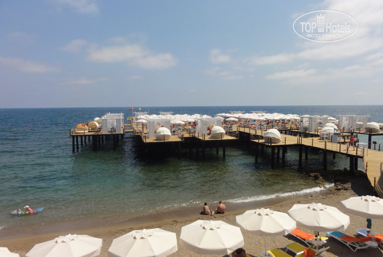 Как уже отмечалось. Можно было заходить на пляж с берега, а можно было с пирса. С берега мы не заходили-ничего сказать не могу. Отдыхали мы без детей, так что нас такой заход не испугал.