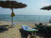 На пляже лежаки и зонт платные,сумму точно не помню,но многие лежали просто на полотенцах своих.Возле шезлонгов мелкий песочек,а вот вход в море крупная галька и камни,нужна спец.обувь,которая продаётся в отеле и соседней деревушке,можно брать с собой кроксы,вполне подойдут. Есть пантон.