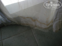 Грязные занавески также нам встретились, еще белье с недостиранными пятнами - тоже в наличии. Паршивый отель так-то.