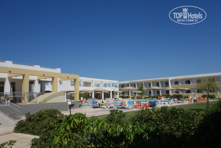 Отель находится в 8-10 минутах ходьбы от пляжа, но дорога совершенно не напрягает. Отель большой, 6 корпусов, если вы ищите маленький греческий отель - вам не сюда. Народу много, соответственно толпы в ресторане, но очередей за едой практически нет. Есть корпуса с видом на море, но они выходят на небольшую дорогу (мы жили в таком), есть с видом на сад.