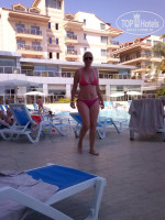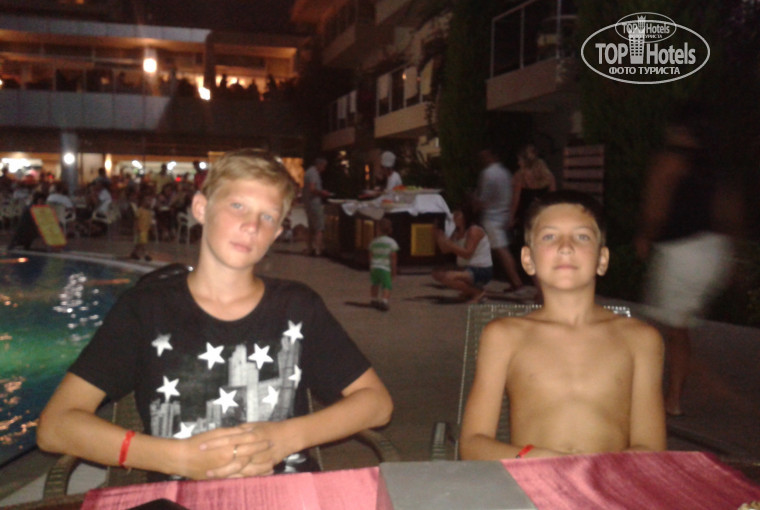 От аэропорта до отеля 1 час. Заселили быстро.Номер нормальный Одна большая и одна двухъярусная детская кровать. Окна выходят с балконом на другой отель.Приехали к ужину.Столики около бассейна уже все заняты были,надо занимать заранее перед ужином на улице внутри ресторана жарковато.В номере убираются раз в день-но так быстро почти не подметая,бельё меняют не каждый день.Шампунь лучше брать с собой Дают один гель для душа-пришлось ходить на ресепшен выпрашивать.Питание хорошее.Лучше чем в Египте в отеле 4*.Много зелени,из фруктов -арбуз,дыня,апельсины,яблоки. Берёшь сколько хочешь-никто ничего не говорит.Из мяса-куриный шашлык,курица,индейка,почки,котлеты из баранины,баранья печёнка.Питание хорошее.В номере чайника и утюга нет! Бар на территории не круглосуточный-только до 2-х ночи. Чтобы попить кофе в 5-ти утра надо ждать завтрака. Второй раз уже не поеду. Пляж нормальный.До пляжа 3-и минуты пешком или минуту на маленьком автобусике.Анимации практически-нет! Вечером диско для детей-потом быстро какой нибудь конкурс и приглашают на дискотеку в город! Дискотека в городе полная ...! На экскурсии не ездили! Говорят ерунда! Если ехать за джинсами -то лучше своим ходом! До Манавгавта -там джинсовый фирменный магазин MAVI и магазин WAIKIKI-джинсы хорошие стоят 159 лир -т.е 50 долларов.На рынке в Сиде какой-то турок предлагал полное гавно-китайский ширпортреб за 30 долларов-которые и 10 долларов не стоят!!!! Так-что на рынке ничего нет в Сиде кроме сувениров.