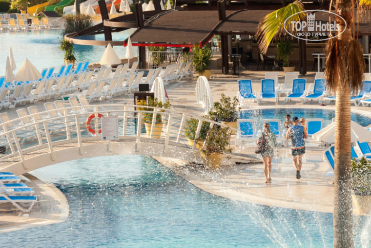 Территория отеля производит впечатление - огромные бассейны, отличные водные горки (лучшие в этом районе, говорят). И дети, и взрослые получали море удовольствия каждый день. Дуга с "ватрушкой" - супер. Но именно из-за того, что все территория занята бассейном, тени нет. Номер - вроде красивый, ремонт свежий, а вывернутая розетка не смотрится. Балкон, вид немножко на бассейн, преимущественно на парковку. Балкон удобный. С кондиционерами в номерах нормально, в в лобби, ресторане и коридорах их просто нет, душно и жарко.