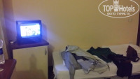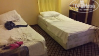 По поводу номера, номер предназначен для четверых (двухспальная кровать - 1 шт., односпальная - 1 шт. и раскладушка) , мебель уже не новая, ванная комната очень маленькая, в целом номер требует ремонта, находясь в номере чувствуешь себя неуютно. В номере вечером темно, горит одна лампочка, в коридорах отеля тоже темно. В номере отсутствует сейф и за сохранность вещей в номере отель не несёт ответственности, поэтому воспользовались сейфом при ресепшене (1$ - в сутки). Охраны при отеле тоже нет, заходи кто хочет. Перед отъездом в соседнем номере произошла ссора, в итоге на девушку, которая выбросила с балкона стулья, стол и вела себя неадекватно, администрация отеля никак не отреагировала, хотя крики слышали и постояльцы соседних отелей.