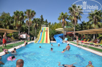 Территория отеля компактная, симпатичная, зеленая. Много сосен, пальм, кустиков. Есть несколько бассейнов, один бассейн с двумя небольшими горками, горки работают по часам, народу много - и взрослые, и дети с удовольствием катаются. Есть детская площадка - маленькая, но приятная. На территории отеля во время нашего отдыха жила кошка с котятами, по утрам дети кормили котяток и маму-кошку, а по вечерам даже пропускали мини-диско, играя с ними.