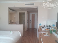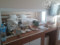 За неделю до вылета зарегистрировались в программе бонусов от отеля на Top Hotels и отправили свои пожелания по размещению: как можно выше и с красивым видом. По приезду были приятно удивлены тем, как все было выполнено. Номер 2428 во 2 корпусе на 4 этаже, расположен ближе к морю. Это один из немногих номеров категории «Стандарт» на 4 этаже, так как в основном там все 2-х этажные «Семейные» номера. В данном корпусе на полу плитка без коврового покрытия (для аллергиков).