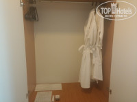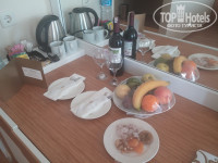 В номере халаты, тапочки, набор для приготовления чая и кофе, а также нас ждали подарки от отеля: корзина с фруктами, сладости, вино и сумка. Халаты с символикой отеля продаются на ресепшине по 30 эвро.