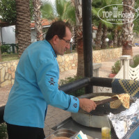 Краеугольный камень всех комментариев. Вот мне интересно, вот те, кто ругает отельную кухню, с чем они сравнивают? С первоклассными ресторанами, где привыкли питаться, или со своей домашней кухней, находящейся на таком же экстра-уровне? Наверное… По мне, так питание более чем хорошее. Такого выбора самых разнообразных блюд лично я дома не имею, и потому проблема одна – при таком разнообразии соблазнов держать себя в общечеловеческих рамках разумного пищевого поведения (проще говоря – не переедать). В двух словах – если уж ничего нет(???) – кушай куру и индейку. Каждый вечер что-то жарят, курица, индейка, рыба. Между завтраком и обедом вообще ситуация интересная, пекут такие лепешки с начинкой (мясо или творог или картошка), настолько вкусные, что стоишь перед выбором – или их покушать, или на обед попасть. При этом нужно отметить, что персонал очень приветлив и расторопен. Мальчишки-официанты как муравьи, быстрые, мелкие и многочисленные. Постоянно в зале их «старшина», не помню как зовут… В общем, порядок, внимание и проворность. Шеф-повар Аллаттин постоянно в зале, за всем следит, все контролирует. Все вкусно, особенно понравился их рис. Голодным никто не будет, это точно. Показательно, что шеф-повар кушает в зале вместе со всеми.