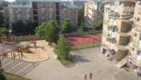 Аэропорт: под навесом из сотового поликарбоната, получаем багаж, встречающие гиды сообщают номер автобуса и через ухабы мимо подсолнухового поля без пешеходного перехода идем на стоянку к автобусам. Кондиционер в автобусе работает только на ходу. До отеля рукой подать, но проспект Пионерский славиться своими пробками. Разместили быстро, номер хороший с видом на бассейн и спортивную площадку, а с 5го этажа даже видно море.