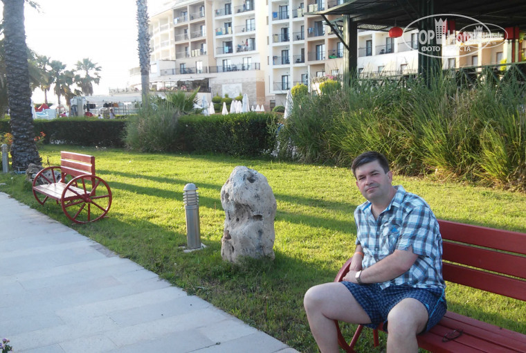 Отдыхали в этом чудесном отеле в начале июня. Перелёт прошел без осложнений(в самолёте питания нет, кроме соков, воды, кофе и чая). Трансфер от аэропорта в отель составил (с обязательным заездом в, так называемый, шоппинг-центр) - 1:40. Удивило то, что в Турции отдыхающих как в аэропорту, так и в отеле не много. На ресепшене нас встретила единственная русскоговорящая девушка(родом из Киргизии), по имени Гулюкан. Очень милая и приветливая, во время отдыха, помогала нам решать все возникающие вопросы. Хотя, если сказать честно, весь персонал отеля, от менеджмента до уборщиц, работает на совесть. Мы покупали путёвки в бунгало, т.к. это на 150 долларов дешевле, но, в связи с тем, что отель был заселён менее чем на 30%, мы попросили номер в основном корпусе. И без каких-либо намёков на дополнительную оплату, нам любезно выдали номер в основном корпусе, но попросили подождать 2 часа, пока он освободится. При выборе номера, стоит учитывать, что с видом на сад они потише, чем с видом на море. Также номера в основном корпусе намного больше, чем в бунгало. Номер имеет стандартный набор мебели, всё чисто и не изношено.Уборка в номере производилась ежедневно,напитки в холодильнике доставляли по мере потребления. Питание в отеле хорошее, всегда всё свежее. Мясо, рыба, фрукты и овощи на любой вкус. Единственное, что было не удобно для тех, кто рано собирается на пляж, это то, что яичницу готовили с 8 часов утра, а не с 7, как во всех отелях. Но, кроме главного ресторана, который работал в определённое время, питаться можно было всегда и везде. Территория отеля красивая и ухоженная. Впереди главного корпуса находится вся инфраструктура отеля. Сзади основного здания-бунгало и собственный аквапарк. Пляж размещён близко, что очень удобно для туристов. Также, огромный плюс этого отеля - большой пирс, на котором размещены шезлонги и подушки для загара. Отдельное спасибо хочется сказать аниматорам. Украинские и турецкие ребята всегда находили общий язык с отдыхающими и старались делать всё, чтобы люди не скучали Всю свою работу они выполняли грамотно и не навязчиво. За 14 дней нашего отдыха мы очень сдружились с ними За территорией отеля есть где погулять - небольшие магазины,рынки посещались нами ежедневно.Также от отеля имеется бесплатный автобус, который каждые 30 мин. довозит отдыхающих до собственного крытого базара . Есть где потратить время и деньги.На экскурсии от туроператора не ездили, Манавгат и Сиде посещали сомостоятельно на такси и общественном транспорте. Как я уже отмечал отдыхающих в июне было не много( при вместимости отеля 1500 чел. максимум было 350). Российским туристам тогда был запрет посещать Турцию, украинцев очень мало из-за сложной политической ситуации в стране - но я думаю и очень надеюсь,что в будущем все наладиться. В общем отдых нам удался и мы всей семьей будем рады вернуться сюда снова. Всем рекомендую этот прекрасный отель.