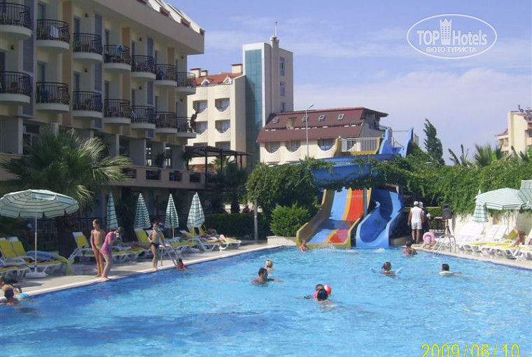 Территория отеля небольшая, но ухоженная, претензий нет. Бассейны тёплые, шезлонгов хватало. Маленький бассейн с хорошей джакузи. Ещё там есть 2 горки. Хотя работают они недолго: с 11 до 12 и с 15 до 16, но и этого времени накататься хватает. Жёлтая горка довольно экстремальная, у неё крутой спуск. Будьте аккуратнее! Отдыхая у бассейна, пользовались почти без меры бесплатной сауной. Можно было и в турецкой бане полежать, но при отсутствии клиентов на платный за 30 долларов массаж она была почти холодной.