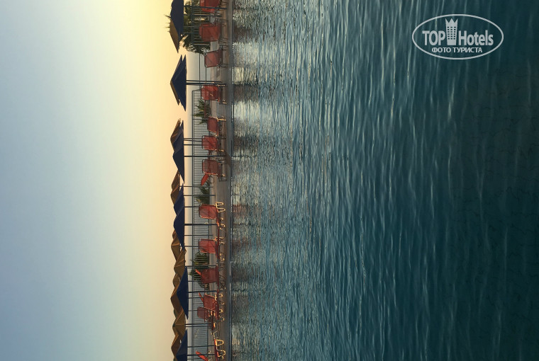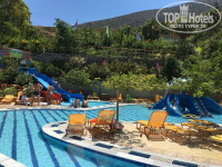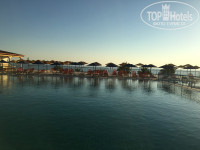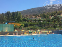 Когда читали отзывы и смотрели фото, казалось, что территория у отеля огромная, на самом деле это несколько обманчивое впечатление. Нет, она не маленькая, но, допустим, в том же самом Бельведере или Мессонги (я здесь буду специально сравнивать именно Греческие отели примерно одного уровня) она гораздо-гораздо больше. Но, в принципе, места всем всегда и везде хватало. На территории расположены 3 бассейна (в наш заезд работали только 2, третий подготовили и заполнили водой практически перед нашим отъездом). Бассейн, который находится недалеко от горок - более шумный и веселый, там вечно происходит какое-то движение и целый день играет музыка))) Вся анимация там))) Утром с 10 до 10:30 - что-то типа йоги (на синих ковриках под навесом), далее акваэробика, водное поло, мини гольф (на площадке за горками) и коктейльные игры (детям среднего и старшего школьного возраста очень нравится). Бассейн довольно чистый и большой. Неглубокий (глубина около 1,60 в самом глубоком месте). Второй бассейн (над рестораном) - тихий и, как нам показалось, скучный))) Зато рядом с ним есть лягушатник для самых маленьких, и для отдыха с детьми младшего возраста он, наверное, подходит лучше (никто в тебя не попадет мячом, не толкнет и пр.). Этот бассейн глубже (около 2 метров). Рядом с ним постоянно пустые лежаки и зонтики, т.к. все в основном идут в бассейн у аквапарка. Занимать места с раннего утра не приходится))) Кстати, несмотря на то, что отель был переполнен, мы всегда после завтрака (около 9 утра) могли найти свободные лежаки в тени. В бассейнах вода морская напополам с пресной, плавать в них приятно.