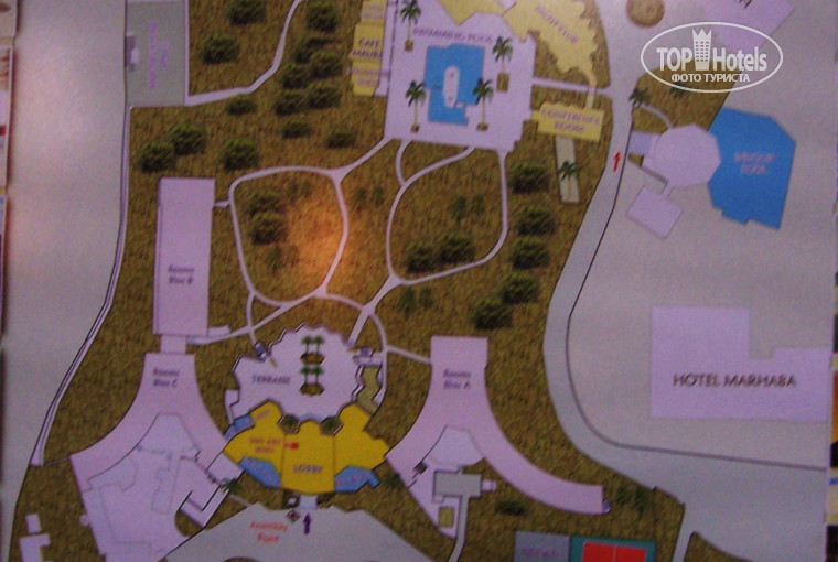2). Если окна номера выходят на центральную часть территории отеля, значит, Вы не сможете уснуть до 00:00 часов, так как на террасе (на плане прямо над рецепцией) проводиться анимация. А по московскому времени до 3-х ночи.