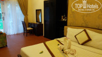 Номер. Номер представляет собой отдельно стоящую виллу со смежной парой номеров. То есть один домик – это два номера с одной общей стеной, через которую иногда слышно соседей. Каждый такой номер имеет свою террасу, на которой имеется лежак, два стула, столик, сушилка для белья и при входе большой горшок с водой и черпаком из палки и половинки кокоса для смывания песка с ног после пляжа. Номер обставлен мебелью из темного дерева. Имеется кондиционер, телевизор с кабельным телевидением (в основном на вьетнамском), есть бесплатный сейф. Ежедневно столик в номере пополняется пакетиками чая и кофе и двумя бутылками воды. Платный минибар со снеками, лапшой, пивом и газировкой, а также опять-таки двумя бутылками воды, но теперь уже не бесплатными. В номере есть халаты, сланцы, зонтик и пляжные полотенца. В номере есть ванная комната с душевой кабиной, феном и всеми необходимыми ванными принадлежностями (полотенца, зубные щетки, расческа, гель для душа, шампунь, мыло, ватные палочки, шапочка для душа и все это пополняется ежедневно). Кроме вилл в отеле есть еще номера Standart в корпусах, единственное их отличие от вилл, то что у них нет собственного балкона.