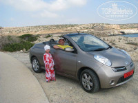 Рядом с аптекой - замечательное бюро экскурсий, где работает замечательная девушка Катерина. Она киприотка, но очень хорошо говорит по-русски. Мы купили у неё билеты в аквапарк дешевле, чем в самом аквапарке со всеми его скидками! Пусть и чуть-чуть, но приятно... У неё же мы взяли маленький почти новенький кабриолетик Nissan за 60 евров/день на 3 дня. Не цена, а сказка:) Катерина, не втюхивая нам путёвки, так увлекательно рассказала и нарисовала на карте, где что в их стране стоит посмотреть и куда съездить, что мы решили самостоятельно совершить экскурсию по Кипру... И действительно - это сказочная страна! Мы нашли водопад, Гробницы царей, Место рождения Афродиты. А какой кайф ездить на кабриолете по чистеньким идеально ровным дорогам... Просто песня... Левостороннее движение? Чушь собачья - 15 минут на адаптацию и всё океюшки. В общем, с бензином ушло меньше 250 евров. Класс!!! Гора-а-аздо меньше, чем экскурсии на троих в те же места... Но! Катя - я обязательно вернусь и даже экскурсию закажу по морю... Или арендую у тебя лодку-кабриолет :)