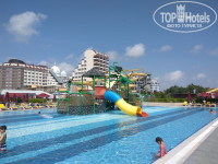 Сам тематический парк разбит на несколько зон,где можно покататься на горках в аквапарке,полежать с детками вдоль детского аквапарка,несколько взрослых бассейнов,снейк бары(2,но так как еще не сезон работал только 1,но всем хватало и столиков и внимания персонала),детская развлекательная зона,места где можно покушать мороженное,лепешки(вкусные),около пляжа бар(вода,кофе,чай,холодный(ледяной)десерт,пиво)