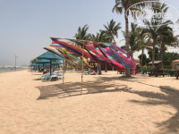 Отель на 4-ку с боооольшим минусом. И пока администрация не позаботится о питании и уборке пляже я его НЕ РЕКОМЕНДУЮ! Я против бассейнов на море. По разговорам с отдыхающими, у кого-то Wi-Fi ловил в отдельных местах номера. Начну с самого прилета. Встретили в аэропорту, групповой трансфер. Отель BIN MAJID BEACH RESORT (не путать с BEACH HOTEL) самый ближайший к аэропорту, но из-за того, что находится на другой стороне дороги, привезли нас самых последних. Заезжали еще в 3 отеля, вся дорога заняла около 2-х часов (знала бы-взяла б такси). Заселили быстро, предварительно взяв налог 15дирхам за сутки (7*15=105дирхам) это 30$. На ресепшене сидит русская девушка Светлала, сразу все рассказала-объяснила и перевела администратору. Также сразу взяли там переходник к местным розеткам 5$ под залог. Номер ПРЕМИУМ ШАЛЕ, см.фото. Сейф, мини-бар (пиво,вода,кола,спрайт,чай,кофе,сахар,сливки) пополняется ежедневно. Убираются не идеально, зеркала в пятнах остаются, душевые наборы пополняют тоже каждый день-не жалеют) Свет в ванной тусклый, девушкам краситься не вариант, очень темно. Раковина очень высокая и не удобная, ни для меня,ни для 5-ти летнего ребенка тем более (ставила стул,чтоб хоть как-то умылся).