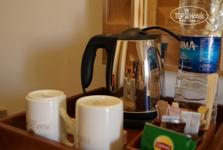 Номер - чистый, уютный, но маленький. Большой минус-номер располагался на четвертом (последнем) этаже и имел мансардный тип планировки. Потолок был скошен и нависал над головой. Для меня это было не критично, но малость неуютно. Так что, если Вы хотите отдыхать с еще большим комфортом, старайтесь не заселяться в номера на последних этажах под самой крышей. В номере чисто, уютно, стоит чайный набор (чайник, две кружки, пакетированный чай и кофе, сахар), телевизор (о каналах ничего не могу сказать, за 11 дней я ни разу его не включила), холодильник и бар, который пополняется каждый день и входит в стоимость проживания. Уборка каждый день, замена полотенец - каждый день. Здесь все на высоком уровне, не могу придраться. Бутылка воды, 1,5 литра каждый день ставится в номер. Вообще в отеле нет проблем с питьевой водой, на каждом шагу можно взять или попросить в баре маленькие бутылочки воды. Мебель в номере старовата. Но, в целом, номер неплохой.