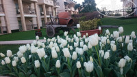 Территория - роскошная, большая, ухоженная! Это рай! В марте цвели красные тюльпаны. Потрясающий контраст красных тюльпанов и голубой воды бассейнов. На территории есть пруд и лебеди. Цвели миндаль и вишня. И пели птицы, чего летом, в сильную жару не услышать.
