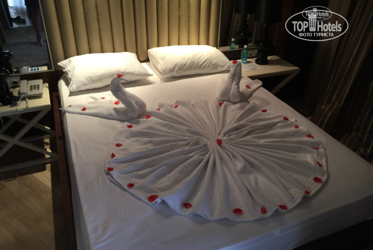 Нас было семеро: Я(40),жена(37),сын(10),дочь(16),брат(30),кум(41),кума(хз).Нас четверых поселили в двухкомнатный номер(1431) с видом на море и басик, номер просто охрененный ,две плазмы,два сплита,два балкона,холодильник большой(все нулячее),а главное не надо карту вставлять чтобы свет был.Кто с семьёй очень рекомендую.Брат жил один в номере 1328, тоже двухкомнатный но попроще.Кум и кума в номере 1428 одна двухспалка и стандартная кровать.Ни копейки за заселение не платили.Один раз дал уборщице 5 баксов вот и все расходы на персонал.Ездили в аквапарк Легенда через отельного гида цена по прайсу 65$ взрослый, 55$ детский,договорились по 50$ по кругу,тогуйтесь.