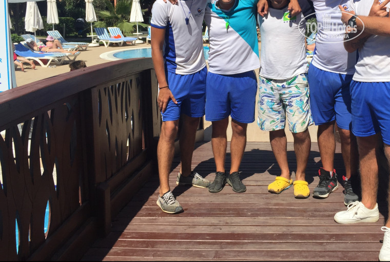 Всем доброго дня! Никогда не писал отзывы, но тут другое дело....... Дал слово, в том числе и самому себе!) Итак, отель Palmeras - отличный отель!!! Отдыхали с 9 мая по 17 мая 2017г. Сам отель небольшой, но настолько уютный и инфраструктурно развитый, что ощущаешь себя как у себя на дачном участке!) Сами номера небольшие, но опять же, очень уютные! В большинстве своем, с отличным видом, но есть несколько номеров с видом на улицу (ну очень неприятно, особенно когда остановился на длительное время). Кстати, было так же и у нас, но 20 минут качания прав и угроз Гаагским судом по правам человека, в купе с Международным трибуналом, сделали свое дело! По поводу еды, тоже все хорошо: 3 приема пищи, плюс кормежка в промежутках! Все есть и всего вдоволь! Вот соки пить не рекомендую-козленочком станете!))) Бассейн великолепный, плюс 2 прикольные горки. Есть, кстати и лягушатник для детишек, метрах в 2 от основного бассейна. Отель на 1 линии от моря, что очень близко, конечно. Лежаки, полотенца и прочая лабуда, все ровно, все хорошо! Единственный и ужаснейший минус отеля-это Wi Fi!!! На вопрос: "какой он?", ответил бы так: "лучше б его не было!" Это какое-то проклятие этого отеля, этот Wi Fi. Сигнал-то отличный, а вот скорость........ Наши улитки-олимпийские спринтеры, по сравнению с их Wi Fiем. Что касается персонала, то тут все прекрасно! Очень внимательные, опрятные и улыбчивые люди. Ну и конечно АНИМАЦИЯ!!!!! Это то, ради чего я пишу этот отзыв!!! Это то, что оставило неизгладимое впечатление!!! Это то, что превращает все минусы отеля, в его плюс!!! Это Космос!!! Лучшее, что я видел, а видел немало!!! Динамика, экшен, драйв, спорт, веселье и это лишь небольшая часть ассоциаций с этой командой аниматоров!!! Практически вся команда аниматоров из Грузии, что само по себе уже заранее ярко, весело, задорно и эмоционально!!! Итак, Элиза, старшая этой суперкомпашки: я так и не понял на скольких же языках она говорит? 5, 10, 20??? Всегда в тему, всегда лаконично и всегда занимательно! Заводит всех, даже если ты с ночи, после обильных возлияний никак не заводишься!))) Вторая и последняя дама в этой сугубо мужской компании Гванца (прошу прощения за, возможно, неправильное написание имен): детишки отеля Palmeras влюблены в нее все и сразу! Весь световой день и даже после ужина, она с детьми! В ней бьется 2 сердца, а иначе как объяснить такую выносливость?! А её клич: "Мини диско, гоу, гоу, гоу", до сих пор собирают всю мою семью после ужина Далее Мистер Алекс.... Единственный не грузин в этой Великолепной Шестерке аниматоров! Во-первых душевный парень! Во-вторых веселый и яркий Человечище! В-третьих, это человек-волейбол, ибо эта игра-его вотчина! Всегда на позитиве и полон сил! Мистер Тато...... Капитальный красавчик! Человек-водное поло! Зажигает, отжигает просто разрывает публику! Мне кажется даже мертвого разбудит и заставит улыбаться!))) Мистер Лаша.... Ахренеть как двигается Танцует лучше меня и это со времен Майкла Джексона Человек-акваэробика! Все женские половины Palmeras, всегда были рядом с ним и я, признаться, основательно завидовал ему Кнопки "выключить" в нем просто нет, всегда в движении!))) Мистер Катастрофа Панда...... Лидер команды, предводитель стаи, вождь краснокожих!!! Красапета во плоти Человек-зажигалка))) Вечный двигатель))) Что бы я еще не сказал, его надо видеть, а не слышать о нем. А что они творили на вечерних шоу программах?! Мы так в C