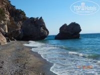 Теперь о пляже : до моря рукой подать, меньше минуты! Пляж песочно –галечный, вход в море галька. Лежаки бесплатно. Полотенце берем в хамаме утром. У рыбаков можно заказать креветки : порция 10шт стоит 10 дол.