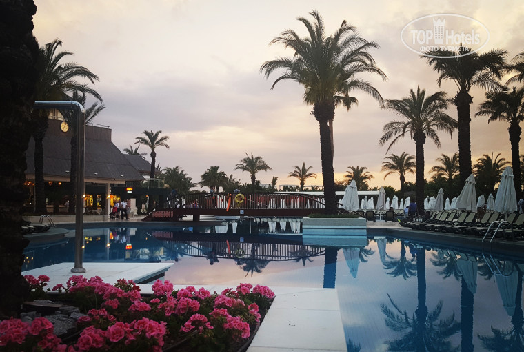 Территория отеля небольшая, компактная и красивая. Несмотря на небольшую площадь-в отеле совсем не ощущалось скопления людей, не было очередей в барах и ресторанах. Единственное что не понравилось, это десткий клуб и площадка. Плошадка старая, не хватало батутов и лабиринтов (как в альва донне в Кемере), сам мини-клуб и аниматоры были отвратительны. Я бы на месте менеджера отеля отправила бы их на стажировку в кемеровскую альву для повышения квалификации, так мини-клуб и аниматоры превосходны!!!