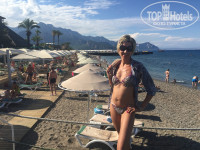 Пляж. Отличный ! Вода - близко. Три ряда топчанов - и сразу море. Пару раз бывала в отелях - первая линия - а пляж - далеко - то есть сама вода - далеко. Песка много - до воды - а тут -нет лежишь на топчане - и через 2 метра ребенок плещется в море - легко присматривать. Пляж хорошо оборудован, стационарные тенты, с крючками для одежды, столики, урны, у каждой пары топчанов ! Топчанов хватало всегда, но если прийти чуть позже - просто центральные заняты - а чуть вправо-влево - сколько хочешь ! На пирсах - тоже топчаны - и когда ребенок спал - я с коляской перебиралась на пирс - там такой обалденные вид на море и горы... Ночью пляж убирают, топчаны расставляют, песочек граблями причесывают... Ходила на пирс прогуляться с коктейлем после диско... все сама видела... и охранники тут как тут - поздоровались -обозначились - убедились что девушка не пьяная, топиться не будет - и удалились.