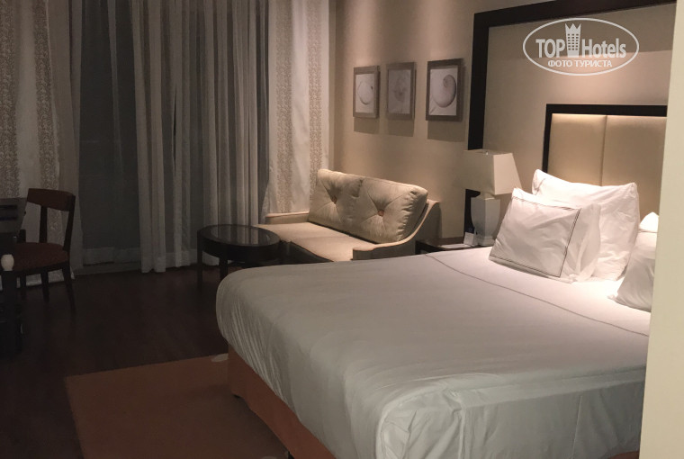 Номера. Они огромные, просторные, чистые, современные (у нас был стандарт с видом на море), нет разве что утюга и гладильной доски. Тапочки, халаты, всякие принадлежности в ванной, все как положено для отеля такого уровня. Убирались нормально, лебедей крутили)))