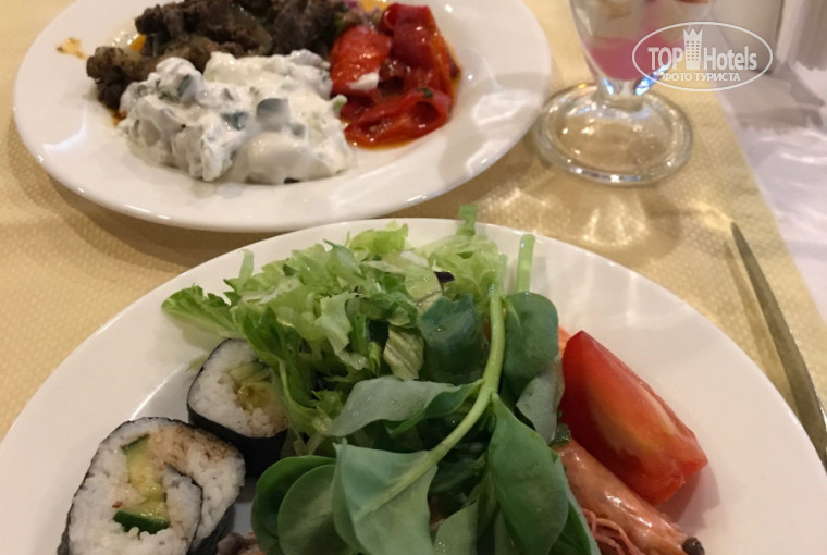 Еды много разной, все вкусно! Были и тигровые креветки, и суши и т.д. и т.п. Официанты внимательные! Раздосадовал тот факт, что в Турции (в любом отеле) сладости подают только на обед и ужин. Мороженое (которое я просто обожаю!) в этом отеле только с 14:00 до 16:30, поэтому попробовать не удалось (печалька), о качестве судить не могу.