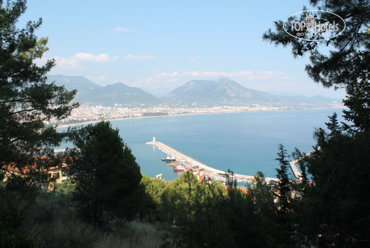 Если вы встанете лицом к нашему отелю, на горе увидете смотровую площадку с флагами на горе. Туда едет автобус 8. Но описать маршрут до остановки этого автобуса я не смогу, тут вам поможет гугл (или пишите в комментарии, я отмечу маршрут на карте). Оттуда открывается вид на всю Аланию и море. Можете присесть в любой кафешке и полюваться. Автобус ходит по расписанию с перерывами до 2-х часов между автобусами, так что сначала определитесь с временем и расписанием.