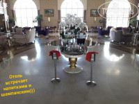 Заказали путевки ещё в феврале. Из родного города мы выезжали большой компанией, я с женой, пара друзей и ещё подруга жены с дочкой, родителями и подружкой, всего 9 человек. Вылет из Челябинска 2 июня, долгое ожидание. И вот мы в отеле. Путь от аэропорта Анталии чуть больше часа с звездом на стандартную стоянку. Отель очень красивый и снаружи и внутри. На лобби вас встречают русскоговорящие работники отеля. Посередине зала стоит столик с освежающими напитками и шампанским.