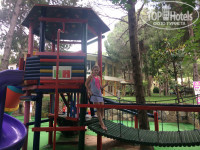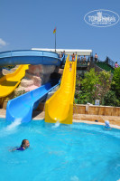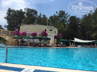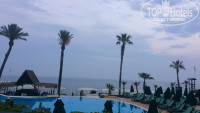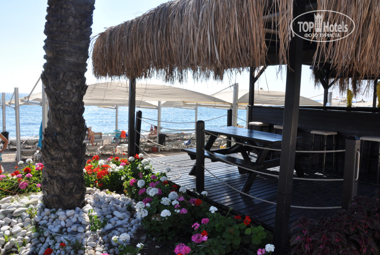 Сама территория отеля очень красивая (сосны, пальмы, цветочки), все дорожки в тени, есть гамаки, зона чаепития и лепешечная на улице под соснами. Отдельная зона для детей (мини-клуб, площадка и игровые автоматы с теннисными столами). Бассейны все теплые и чистые (всего их 2 и в каждом зоны для детей) + бассейн с горками (всегда стоял мальчик-спасатель и следил, что бы дети не сталкивались). Пляж чистый, есть заход по камням с берега и заход с двух пирсов. Мы всегда занимали шезлонги на левом пирсе, там поменьше народу и заход в море с лестницы. Море прозрачное, чистое, было около 23 градусов, вначале показалось прохладным, потом или теплее стало либо привыкли уже. Плавали много и долго, в том числе и в соседние отели (Зигана, Салима, Риксос) рыбок очень много было, их дети с пирса каждый день кормили хлебом. На другом пирсе тоже есть лежаки и пуфики, и есть 2 кабинки платные 25$ на день (кто-то в них всегда сидел – пил, ел)), там же около пирса есть пункт водных видов спорта, но они какие- то не активные, как и почти все работники этого отеля, никого не зазывали, когда мы захотели покататься на банане, нам пришлось самим ходить искать народ (надо было 6 человек минимум найти).