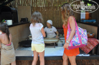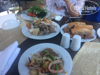 На территории есть один главный ресторан, ресторан-бар на пляже, рестораны аля-карт (рыбный -10 $, и бесплатный турецкий – мы не ходили), ресторан-бистро и ночной перекус (24:00-03:00), блю-бар с бильярдом и кафетерием 16:00-18:00(кофе, чай, пирожные)бар у бассейна, пивной бар на пляже (пиво- Эфес и козел и арахис), лепешечная и чайный домик, бар на диско. В ресторане-баре на пляже можно было неплохо перекусить с 12:30 до 16:00 – овощи, паста, картошка-фри, нагетсы, пицца, бургеры, фрукты. В лепешечной –вкусные лепешки с разными начинками, крошка-картошка. Еда вкусная везде и ее немеренно, очень много свежих овощей и фруктов (абрикосы, арбузы, дыни, мушмала, яблоки, алыча, апельсины, грейпфрукт), клубнику и черешню покупали около отеля слева по 2 $ за кг., за мясом гриль очередь всегда. Много сладкого (пирожные, пахлава, торты, булки, пироги), мороженое. Свежевыжатый апельсиновый сок на завтраках и в лепешечной. На обед и на ужин на столах в ведерках стоит вино и вода в бутылках (охлажденное), кто хочет другие напитки можно заказывать официантам (если дождетесь их)). Для себя поняли, что на завтрак самое-самое вкусное- это пончики, на обед –помидорчики черри и сыр, на ужин –кальмары в кляре или рыба (Дорадо) на гриле.
