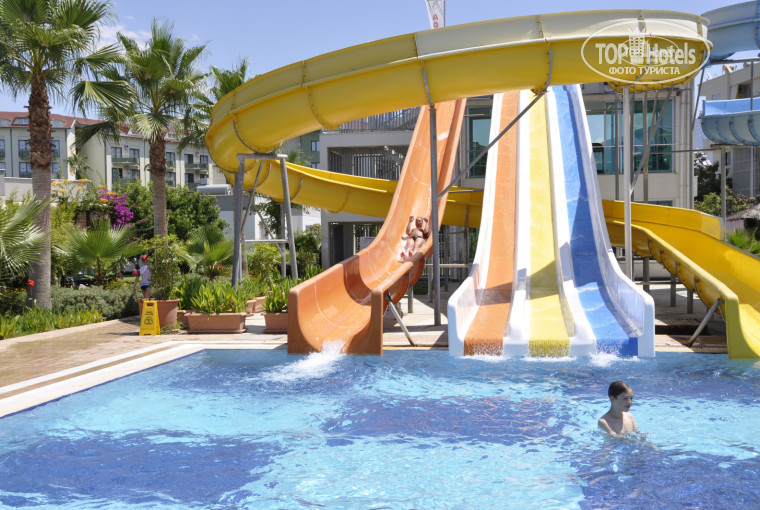 Летали в Турцию от тур оператора Pegas. Отзывов об отеле практически не было, оказалось ранее в отеле были только европейцы, но теперь русских составляет около 50 % 20-30% турецких жителей, остальные, европейцы, и из африки. Вылет самолета был без задержки. Большой плюс, что прилет в Турцию был в аэропорт Аланьи и путь до отеля составил 20 минут. Заселили в номер моментально после завтрака не смотря на то что приехали мы в 7 утра. На ресепшене присутствовал русскоговорящий администратор, что тоже было очень приятно. При заселении выдают карту которая является ключом для номера и вашей кредитной картой, которой вы можете расплачиваться внутри отеля за дополнительные услуги (спа салон, пляж, магазины) В номер заселили в чистый, двухкомнатный, в номере присутствует ними кухня с плиткой, чайником, соковыжималкой и посудой. Номер с балконом с видом на большой бассейн и на МОРЕ. Отель зеленый, на деревьях чего только не растет, апельсины, финики, лимоны, яблоки, гранаты... Еда однообразная, утром яйца, и блюда с ними, салаты, сладости и фрукты по сезоны, по приезду была клубника, потом появилась черешня, также присутствует арбуз, апельсин,персик... В Обед было более разнообразная еда, на ужин была рыба и дичь приготовленная на углях и все также салаты, фрукты, напитки, кофе из автомата вино и сладости. Кофе приготовленное в турке, за лиры. Бассейны чистые, хлорка не ощущается, заборы воды производятся постоянно. Детям на радость было постоянное присутствия мороженого и безалкогольных напитков напитков. Алкогольные местные напитки бесплатные, остальные за любую валюту. Лежаки у бассейна у бассейна бесплатные, матрасов нет. У моря платные как и бар, к чему мы были готовы и утром, вечером, нежились на полотенцах расположившись на песке. На пляж холили соседнего отеля в 50 м, т к там песочный пляж. Анимация активная, постоянно учит русский язык как и местный персонал отеля. WI FI ограничен двумя бассейнами, ресепшеным. В итоге, отель в общем отличный семейный с детьми, т к на дискотеку предлагают съездить в другое место с анимацией. Остальное предназначено внимание для детям, детская дискотека, анимация. Рекомендую отель который находится вблизи у моря и в 5 км от центра чистого города Аланья