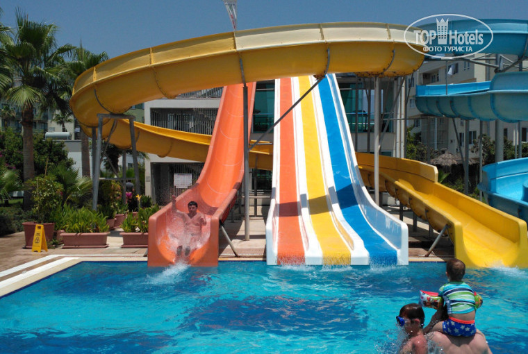 Отдыхали в этом отеле в конце июня-начало июля. 2 взрослых и 2 детей (5 и 13 лет).В Алании уже 4 раз. Были и в хорошей тройке, четверке, плохой пятёрке. Так что есть с чем сравнить. Приехали в отель около 11 утра, заселили сразу же., а не в 14. как положено. 2-х комнатный номер, в спальне 2 односпальные кровати и есть кондиционер, в гостиной-кухне 2 дивана для детей. Холодильник, телевизор, чайник, кофеварка, посуда. Кто.-тр писал про соковыжималку, у нас не было. Питание нормальное, довольно разнообразное, небольшие очереди на ужин. Мороженое весь день, большой плюс. Территория большая, зелёная, с фруктовыми деревьями. Аквапарк работает с 10 до 17. Не все знают, что собственного пляжа у отеля нет, это городской пляж. Следовательно, все платное. Лежаки платные. 2.5 лиры в сутки, оплата при выезде, меньше 50 руб. на наши деньги. Есть волейбольная площадка. Туалета нет, но до отельного совсем рядом, буквально через дорогу по подземном переходу.