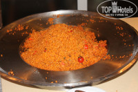 Еда в главном ресторане выше всяких похвал: очень вкусно и разнообразно готовят говядину, баранину, особенно ягнёнка, курицу, индейку, перепёлку, утку. Очень много рыбы и морепродуктов:мидии, кальмары,ракушки, устрицы. Два раза были даже лягушачьи лапки.Море всяких блюд, горячих и холодных закусок, настоящее пиршество, вакханалия вкуса, безумство удовольствия. Я не говорю даже о сладостях, о мёде в сотах на завтрак и прочем. Я наслаждалась в обед и ужин турецкой пахлавой. Приятно охлаждало сытные обеды и ужины мороженое. Очень хороши диетстол и детское питание. Просто молодцы! Вообще еда в "Алкочларе" с каждого куста несётся:куча баров и кафе, где пекут шаурму, пиццу, лепёшки гёзлеме, жарят картошку, пекут разнообразные кондитерские изделия В "Витамин-баре" свежевыжатые соки : морковный, яблочный, апельсиновый.Очень приятный садовый пивной бар,где к пиву подают в плетёных корзиночках жареный в скорлупе арахис. Пиво хорошее, турецкое вино красное, белое и розовое неважное. Крепкий алкоголь не пили, так что судить не могу. Вкусный кофе в зёрнах в турецком и стрит кафе.