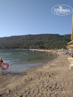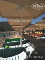 До пляжа идти мин 5 спокойным шагом, свободных лежаков всегда много, соседние справа лежаки и зонты платные, море чистое , иногда бывал мусор в воде, но работники с сеткой его вылавливали. Рядом находится порт, но никаких маслянных пятен, пленок, мы не видели, порт находится справа от бухты где пляж.