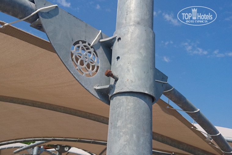 И я не просто так написала о навесах. Чтобы будущие гости этого отеля обращали особое внимание на крепление самого козырька на опоры. Он закреплен одним болтом, остальные 2 отсутствуют. Дай бог, что ничего не произойдет. Смотрите внимательно!!!