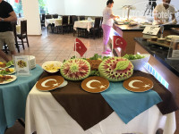 Питание... В принципе хватало всего и мясо-курицы и овощи и сладости, фрукты. Еду заметили, что перерабатывают, что осталось с обеда на ужин (например курицу обжарят добавят овощи и подают), но было даже вкуснее, чем в обед))). Мы голодные не были! Но очереди были страшные, людей было очень много.