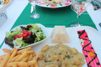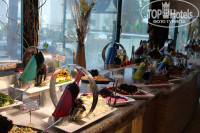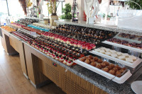 На высоте! Разнообразные блюда, мы не успели все распробовать. Каждый день разные Турецкие сладости, огромный выбор фруктов. Пару раз были роллы, также можно было собрать свой бургер. На улице - гриль. Шашлык наивкуснейший! Также немаловажно то, что внутри имеется санайзер на стене. Очереди были только за грилем на ужине. Очень вкусное мороженое (4 вида). Официанты все до единого улыбчивые и приветливые! Приносили напитки из бара. Следили за чистотой столов. Скатерти всегда идеально чистые. Всегда всем хватало места. Один раз посетили Итальянский ресторан. Еда супер! Порции оргомнейшие. С трудом доели.