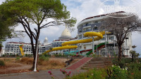 пляж находится через дорогу по подземному переходу и через лесопарковую зону,с 2 детьми минут 7 ходьбы,сам пляж песчано-галечный,заход в воду-галька,не очень комфортно,но не больно точно) пляж для детей не очень: почти сразу глубоко и все время были сильные волны,вода тоже холоднее,чем в цезаре,там прям как парное молоко,а здесь приходилось детей вытаскивать со скандалом,чтоб не замерзли