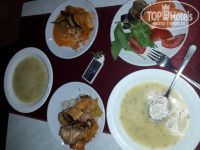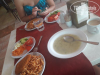 Отель работает по системе все включено. Все съедобно. Голодными не были. Выбор блюд не большой, но всё очень вкусно. Примеры завтрак-обед-ужин выложу на фото. Чай, кофе всегда доступны. Алкоголь мы не пили, один раз попробовали джин. Покупали гранатовое вино в магазине, пили за ужином. А так из представленных напитков в отеле были водка, джин, вино.