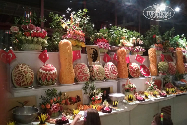 Теперь о еде. Еда очень разнообразная, на любой вкус. В обед и на ужин мороженое очень вкусное в неограниченных количествах. Мы попали как раз на какой-то из праздник, два раза был огромный торт из мороженого и бисквита выносили его очень эффективно с факелами под музыку. Два раза был рыбный день с морем раков и блюд из мидий и криветок. Один раз день турецкой кухни. В стоимость включены два ресторана алякарт турецкий( не понравилось, официант был никакой, долго ждали еду, и меню тоже что и в основном ресторане) и рыбный ресторан ( там мне понравилось, было вкусно и красиво). В основном ресторане есть детский стол, каждый день были молочные каши, разные овощи на пару, печёные котлетки, гарниры.