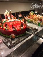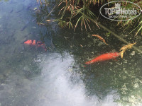 С 12:00 начинался обед в главном ресторане, пошли мы туда. Территория красивая! Впечатляет. Пруд, рыбки, птицы, утки и черепашки. При входе в ресторан дверь открывают милые девушки, предлагают антисептик на руки. Далее- ресторан- большой, столов много, выбор еды тоже впечатляет, очередей никаких нету. Выбираешь стол садишься. Тебя обслуживают официанты, необходимости ходить в бар себе за напитками нету. Все принесут, нальют. Меню меняется ежедневно.