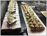 На стойках для салатов и свежих овощей на обед и ужин стояло по 6 больших чашек с готовыми салатами, и по 6 чашек нарезанных свежей овощей. Ни разу я не видела «уставших» или заветренных овощей. Но вот готовые салаты порой были заморожены. Реально берешь сверху салата помидорки или фиолетовый лук - а они только-только начали оттаивать ото льда.