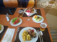 Питание: Мы ели в ресторане на 2-й линии. Общаясь с отдыхающими с 1-й линии сделали выводы, что питание у нас было лучше. Мяса много. Рыба каждый день, но приготовлена хорошо была пару раз. Три раза готовили кальмаров, хорошо. Хороший рис. Картошка иногда не доготовлена. А вот со свежими овощами, как по мне, большая проблема. Мало. Странно для страны с дешевыми овощами. Вялые, заветренные. Моются плохо, потом нарезаются. Песок несколько раз скрипел на зубах. Салаты выглядят страшновато. не ели. Оливки за 10 дней были только один раз !!!! пару раз были прокисшие соусы. Попадались плохо помытые нарезанные фрукты. Сладости хорошие. Вкусное мороженое в баре у бассейна. Чай- плохой "липтон". мы купили каркаде, сами заваривали. Система с напитками , как по мне, очень не удобна. официантов мало, бегают как угорелые. поэтому и дождаться второй бокал пива или вина иногда проблематично. Дают по одному. Выпил- дозаказываешь. В неограниченном кол-ве, можно наливать самим, "соки" и обычная вода.