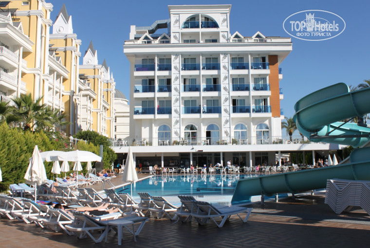 Доброго всем время суток. Данный отель мы посетили в октябре месяце. Ну, что можно сказать про данный отель. Приехали мы поздно вечером, заселение прошло быстро и нам предложили пройти на "поздний ужин" там нас ожидал супчик и овощи, кроче перекусить можно. Номер хороший был,все работало исправно, сам отель выглядит свежим, но территории у отеля нет, бассейн и вся территория. На бассейне есть пару горок. Само расположение отеля хорошее, вокруг отеля множество всяких магазинчиков, до моря идти минут семь, хотя ходит шатл. Питание в отеле нормальное, утром как и везде традиционно, обед всегда что нибудь найдете, ужин даже гриль разный подают, только оговорюсь омаров и креветок при нас не было, но фруктов было много, пару видов винограда, яблок, груш и арбуз, дыня, апельсин тоже присутствовали. Про алкоголь ничего не скажу не пробовали, а вот пиво так себе, на многое не расчитывайте, это же бюджетная пятерка. На пляже есть бар, там можно и выпить и закусить. С лежаками проблем тоже не было, наверное конец сезона был. Рядом вытекает речка и от этого зависит температура воды. Вход в море пологий, что бы нормально окунуться надо метро сто пройти, на пляже песок. Вообщем наш вывод такой, отель мы порекомендуем, но второй раз мы в одно и тоже место не ездием,охота что то новое.